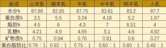 推薦的稀釋比例均在6-8倍,基本的粗蛋白都在20%以上,脂肪都在13以上。筆者仔細看了下原料組成,居然還有用大豆粉之類的容易引起腹瀉的原料。而像這類低檔的產品,往往熱水沖泡靜置幾分鐘后都會出現明顯的分層現象。脂肪含量維持在13%左右,而實際山羊和綿陽乳脂中蛋白遠遠要高于這個數值(轉化成干物質,詳見下表)。一般的代乳粉脂肪含量過高會因消化吸收率問題,極易造成腹瀉的出現。