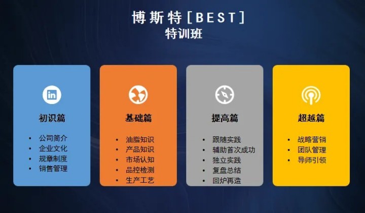 致力于通過(guò)為期一年多的專項(xiàng)系統(tǒng)培訓(xùn),讓新入職的業(yè)務(wù)員領(lǐng)悟企業(yè)文化、熟悉公司、掌握產(chǎn)品專業(yè)知識(shí)、認(rèn)知市場(chǎng)、目標(biāo)客戶心理特點(diǎn)、銷售團(tuán)隊(duì)協(xié)作等,最終使他們成為一名優(yōu)百特銷售精英。