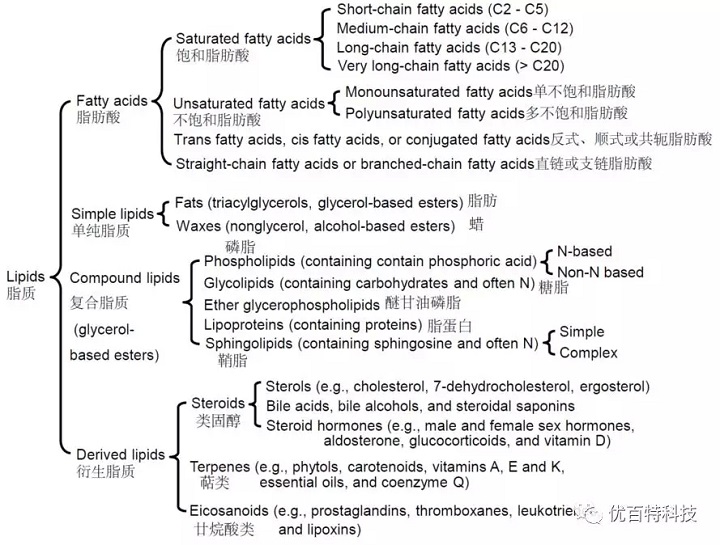 首先要從脂質(zhì)說起。脂質(zhì)又稱為脂類,是一類不溶于水(一些小分子物質(zhì)除外)而溶于有機溶劑(如氯仿和乙醇)的碳?xì)浠衔铩8鶕?jù)Dr. Guoyao Wu 編著的《Principles of Animal Nutrition》中定義[1],脂質(zhì)可以分為脂肪酸、單純脂質(zhì)、復(fù)合脂質(zhì)和衍生脂質(zhì)(見下圖)。