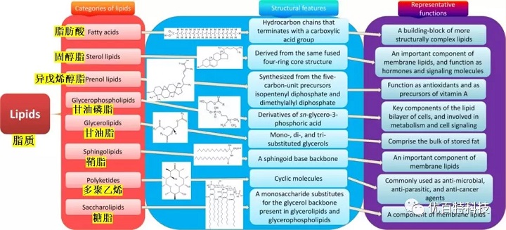 在脂質(zhì)組學(xué)(lipidomics)檢測中,可將脂質(zhì)分為脂肪酸(Fatty acids)、甘油脂(Glycerolipids)、甘油磷脂(glycerophospholipids)、鞘脂(Sphingolipids)、固醇脂(Sterol lipids)、異戊烯醇脂(Prenol lipids)、糖脂(Saccharolipids)和多聚乙烯(Polyketides)(見下圖)。